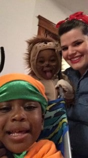 For Halloween, there were two occasions for dressing up in costumes – once for the trail at Lindner Park, and once for trick or treating in our neighborhood. One group with kids went out for trick or treating, while some stayed behind and handed out candy. We were grateful for a box of costumes donated to us – it made for an easy and fun time for everyone!